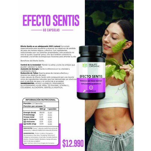 Cada cápsula de Efecto Sentís está compuesta por una mezcla única de ingredientes naturales que han demostrado ser efectivos para la pérdida de peso y el control de la ansiedad.